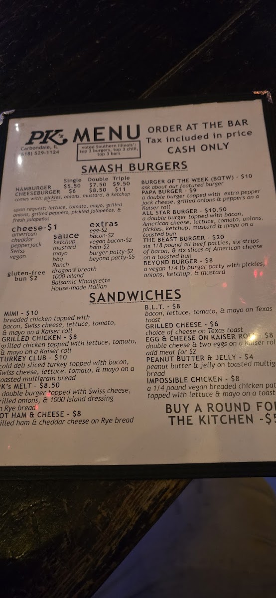 Welcome to PK’s Bar, a hidden gem located at 308 S Illinois Ave in Carbondale, IL. This dive bar boasts an inviting atmosphere, renowned for its smash burgers and eclectic clientele. The menu features standout offerings like the Double Hamburger and Double Cheeseburger, both customizable with a variety of toppings for an unbeatable price. Don't miss the Chili, voted among the top three in Southern Illinois—it's a must-try!